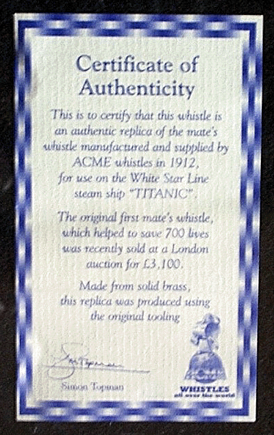 This is to certify that this whistle is an authentic replica of the mate's whistle manufactured and supplied by ACME whistles in 1912,for use on the White Star Line steam ship "TITANIC".